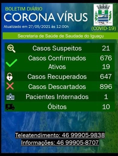 A Secretaria Municipal de Saúde de Saudade do Iguaçu divulgou, na quinta-feira (27), novo boletim epidemiológico da covid-19.