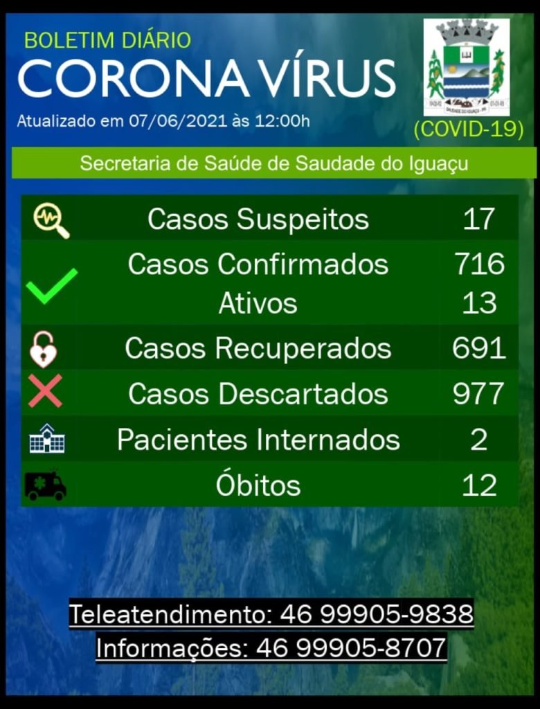 A Secretaria Municipal de Saúde de Saudade do Iguaçu divulgou, na segunda-feira (7), novo boletim epidemiológico da covid-19.