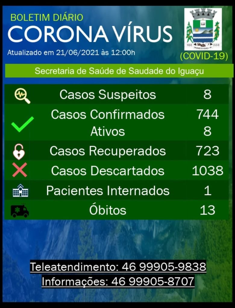 A Secretaria Municipal de Saúde de Saudade do Iguaçu divulgou, na segunda-feira (21), novo boletim epidemiológico da covid-19.