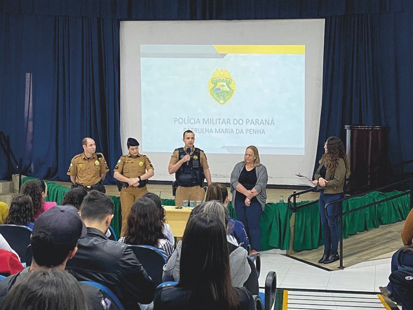 A palestra foi ministrada pelos Soldados da Polícia Militar Abiane Izolan Ribeiro e Ben-Hur Luis Kaiser Corrêa, policiais do 21º Batalhão da Polícia Militar de Francisco Beltrão e técnicos da Patrulha Maria da Penha.