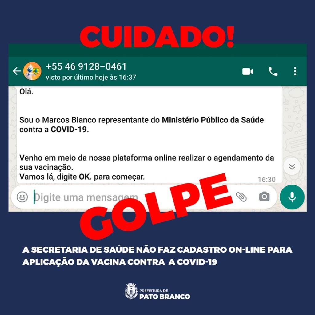 “Está circulando uma mensagem em que um número se apresenta como representante do Ministério Público da Saúde e indica que irá realizar o agendamento da vacina. Não existe dentro das esferas o Ministério Público da Saúde, além de que as vacinas em Pato Branco estão sendo aplicadas nas unidades de saúde dos bairros, na sala de vacina central e pelo drive-thru, sem agendamento.”