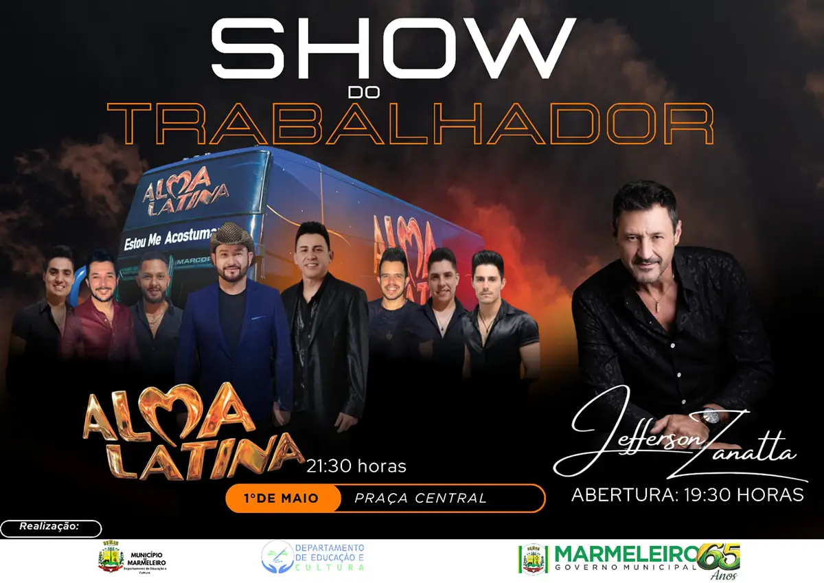 A Prefeitura de Marmeleiro anuncia o Show do Trabalhador 2026, que acontece na noite do dia 1º de maio, uma sexta-feira, na Praça Central do município. O evento é gratuito e conta com a abertura do cantor Jeferson Zanatta, às 19h30, seguida do show principal da Banda Alma Latina, a partir das 21 horas.