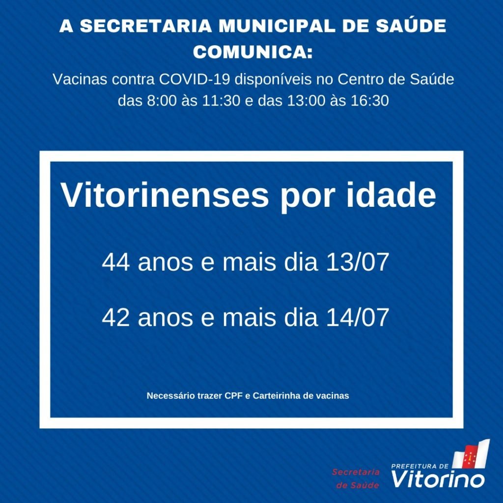 A Secretaria de Saúde de Vitorino vacina contra a covid-19 nesta terça-feira (13) a população com 44 anos a mais e na quarta-feira (14), 42 anos a mais.