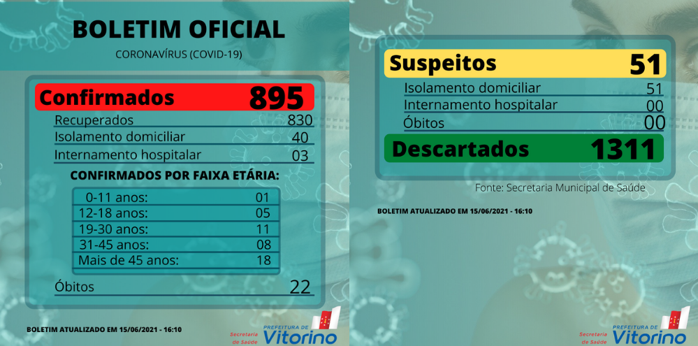 A Secretaria Municipal de Saúde de Vitorino divulgou, na terça-feira (15), novo boletim epidemiológico da covid-19.