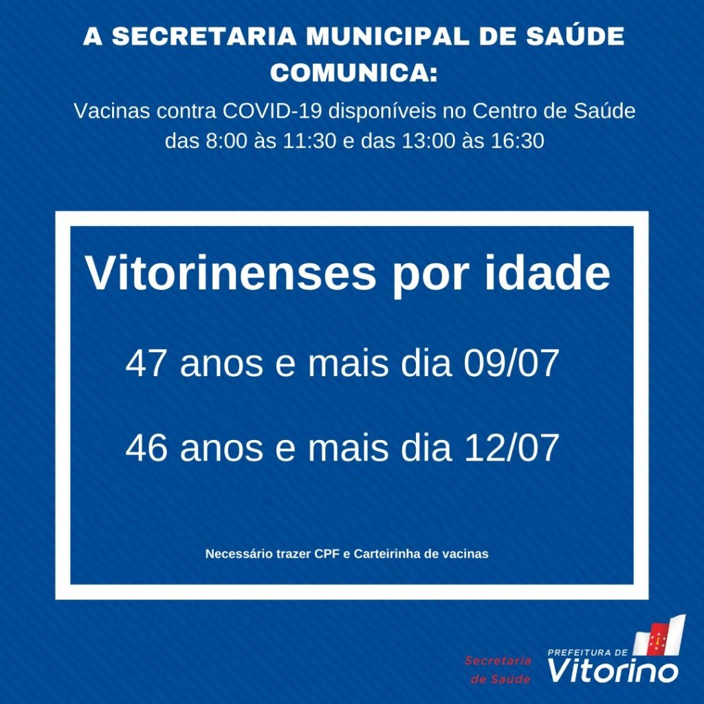 Nesta sexta-feira (9), a Secretaria de Saúde de Vitorino vai vacinar contra a covid-19, pessoas com 47 anos.